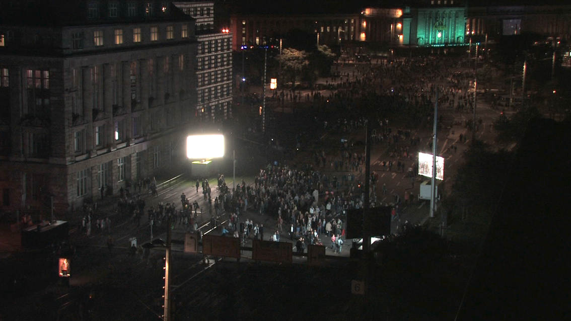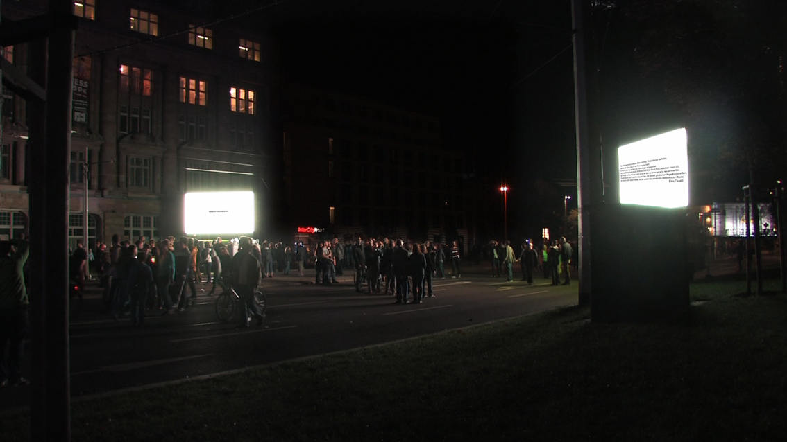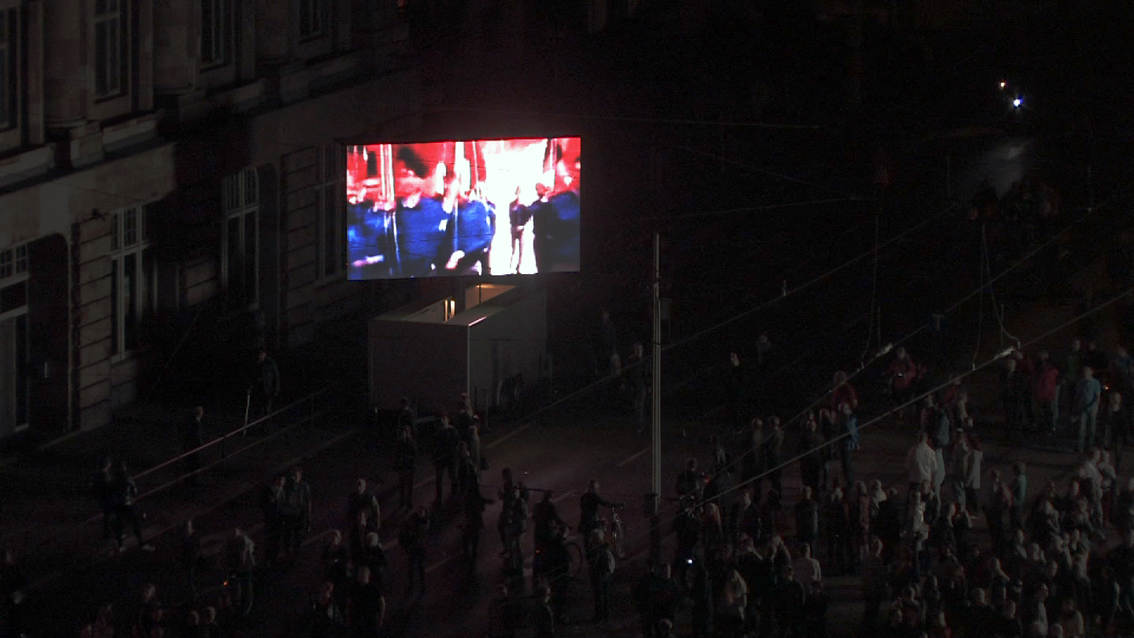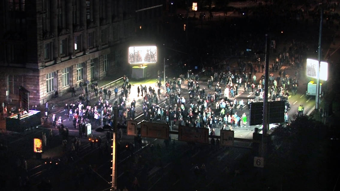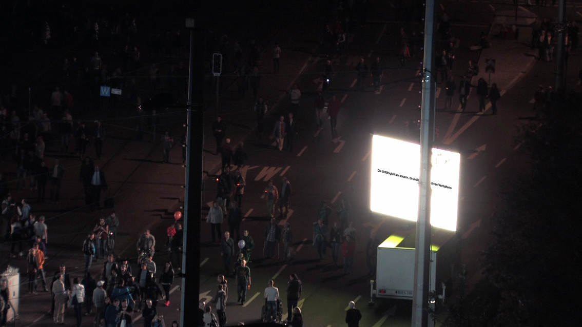 This video/sound installation examines the slogan “We are the people” with regard to its social relevance in 1989 and today, focusing on its inherent meaning in the light of the misuse it experiences from society and the media, on the one hand, and its romantic idealisation on the other. At the same time the piece inquires into the current state of affairs in Europe and discovers the local in the European context, and vice versa.